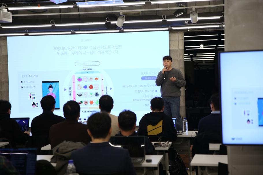 <숭실대 캠퍼스타운 입주기업 우당네트웍(주)이 10명의 투자 전문가 앞에서 IR 발표를 진행했다(사진2=숭실대 제공)>