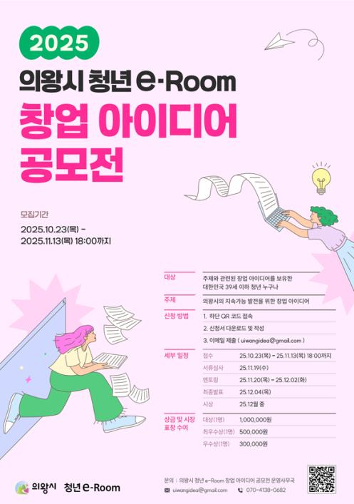 의왕시 창업 생태계를 활성화하기 위한 「의왕시 청년 e-Room 창업아이디어 공모전」참가자(팀)을 모집합니다. 우수한 창업 아이디어를 보유한 분들의 많은 참가 바랍니다.