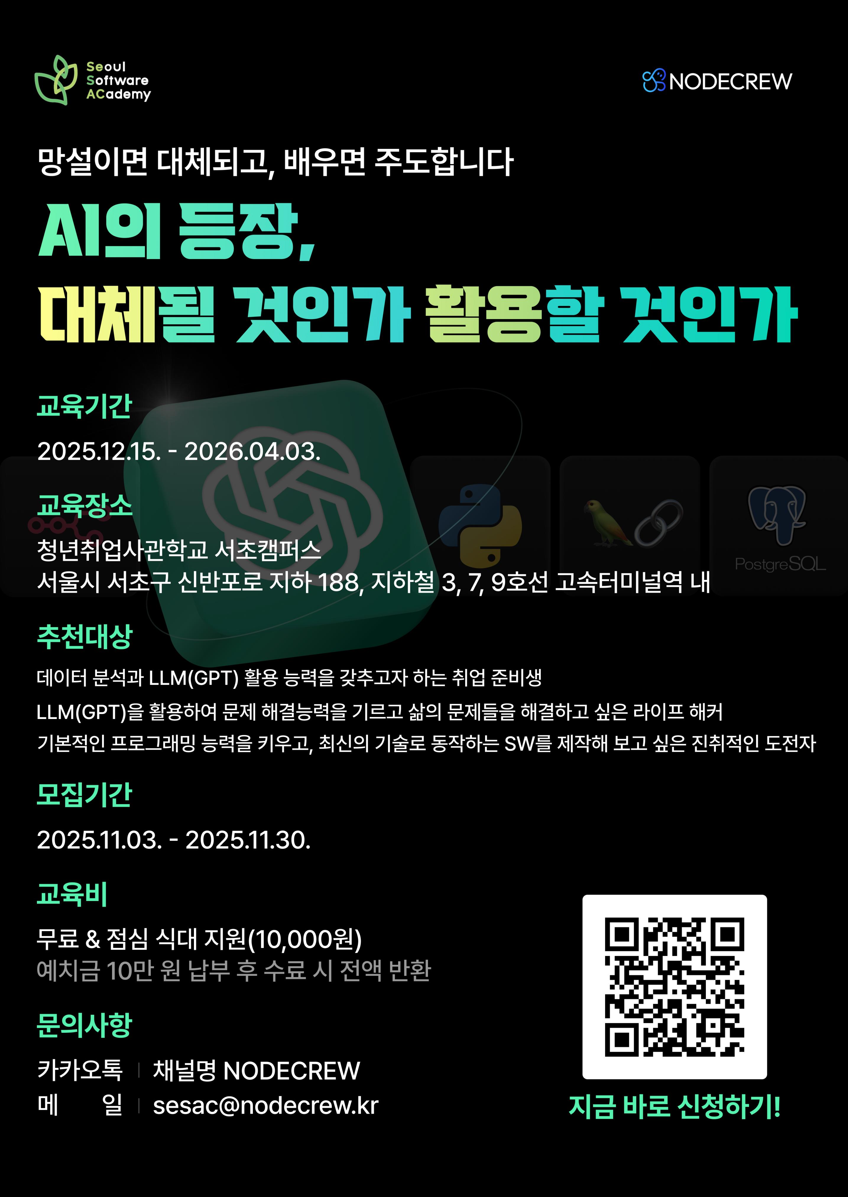 [도봉구청년창업센터/노드크루] 청년취업사관학교 송파캠퍼스 - AI융합교육 참여자 모집2025.11.12