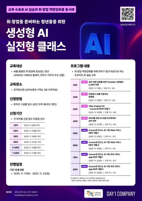 308관악구청에서 취·창업을 준비하는 청년들을 위하여 「생성형 AI 실전형 클래스」 교육참여자를 모집중이니 취창업 청년들의 많은 관심과 참여바랍니다.