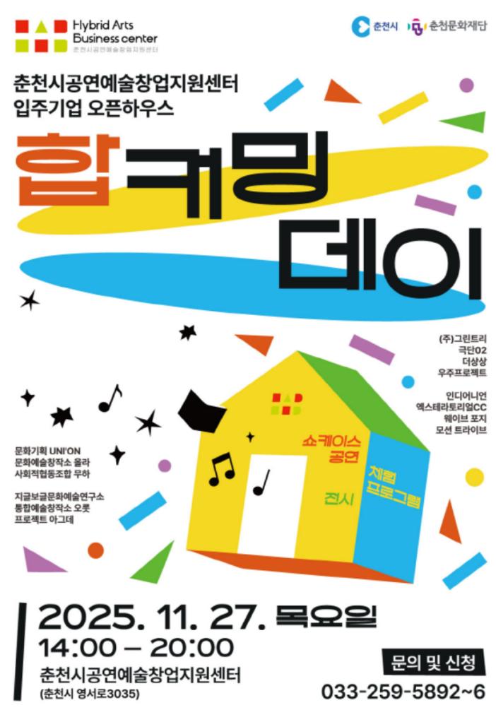 375춘천문화재단-춘천시공연예술창업지원센터(합센터)에서는 입주기업의 성과를 공유하고, 전국 대학과의 실질적인 산학협력 모델 발굴을 도모하고자 ‘2025 입주기업 오픈하우스행사 <합커밍데이>’를 개최합니다.