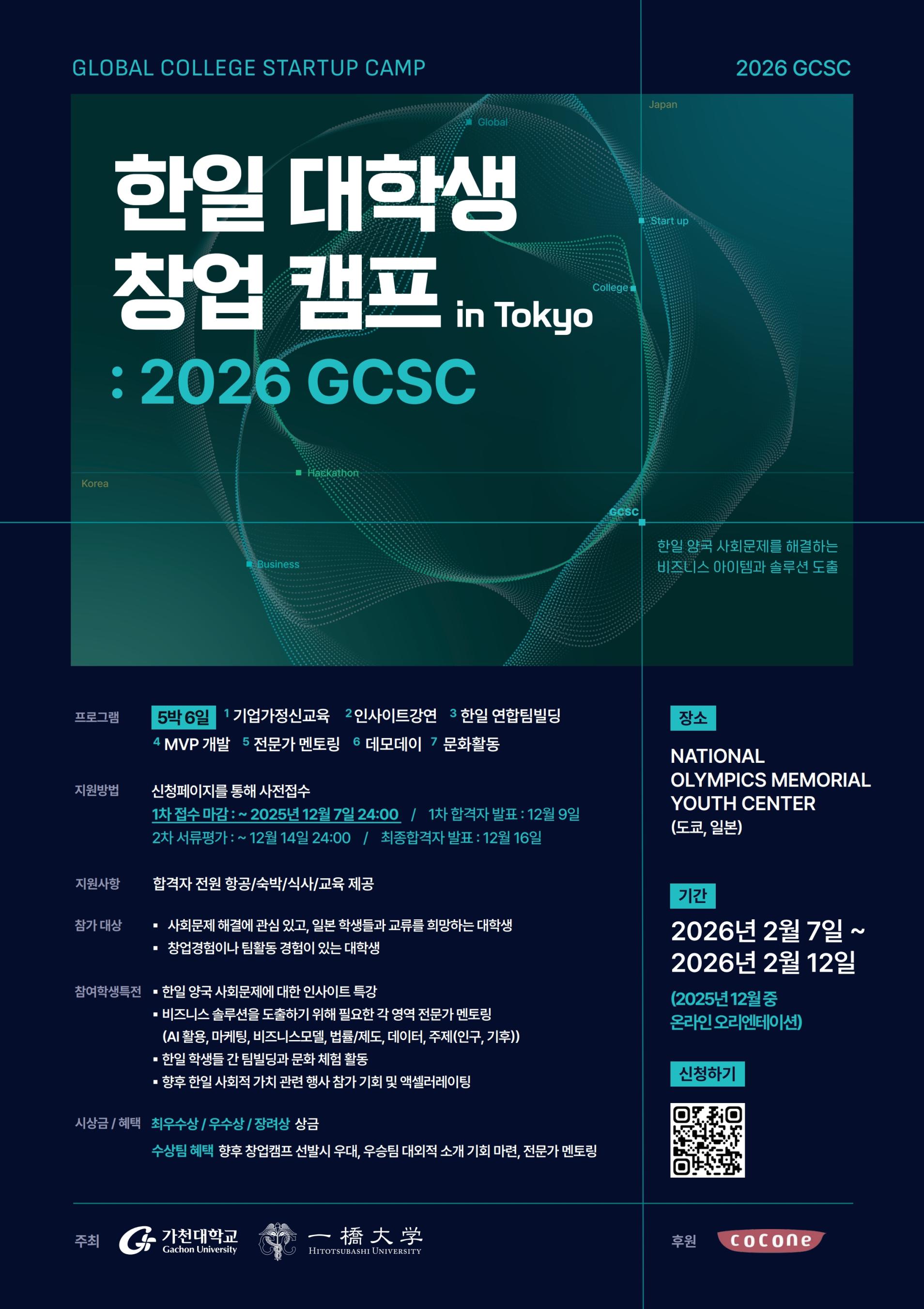 가. 행 사 명: 「한·일 대학생 창업 캠프 in Tokyo : 2026 GCSC」나. 캠프기간:2026. 2. 7.(토) ~ 2. 12.(목)
