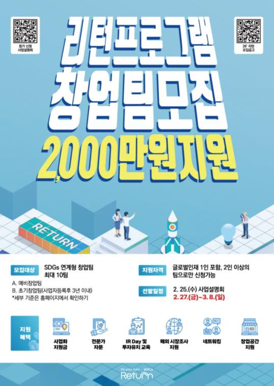 □지원내용: 사업화지원금(예비/초기창업팀 최대 2,000만 원, 계속지원팀 최대 3,000만 원), 자문 제공, 창업 역량강화 교육(이론, 실무), 해외시장조사, 네트워킹, KOICA 내부연계, 창업공간지원, 사업성과 공유 및 상금, 창업팀 대상 맞춤형 사후관리 지원 등