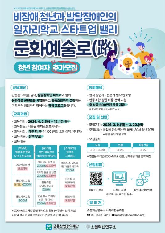 62소셜혁신연구소 사회적협동조합은 금융산업공익재단의 지원을 받아 청년과 발달장애인이 팀을 이루어 협동조합 창업 과정을 경험하는 「비장애청년과 발달장애인의 일자리 학교, 스타트업 밸리 문화예술로(路)」프로그램을 추진하고 있습니다. 많은 관심과 참여 부탁드립니다.